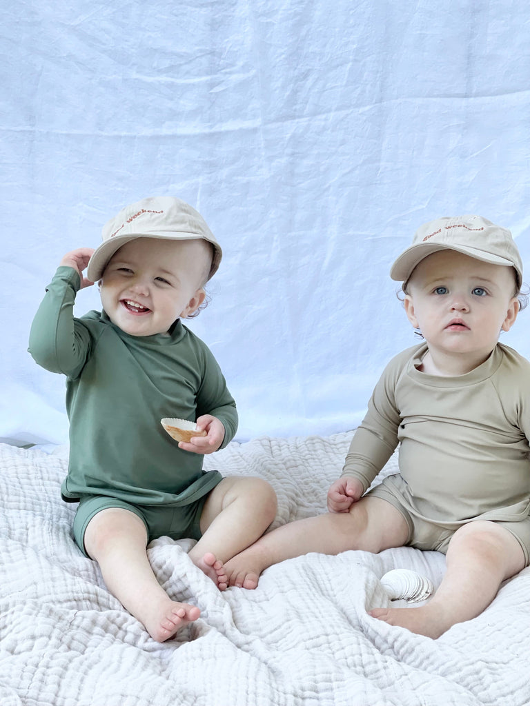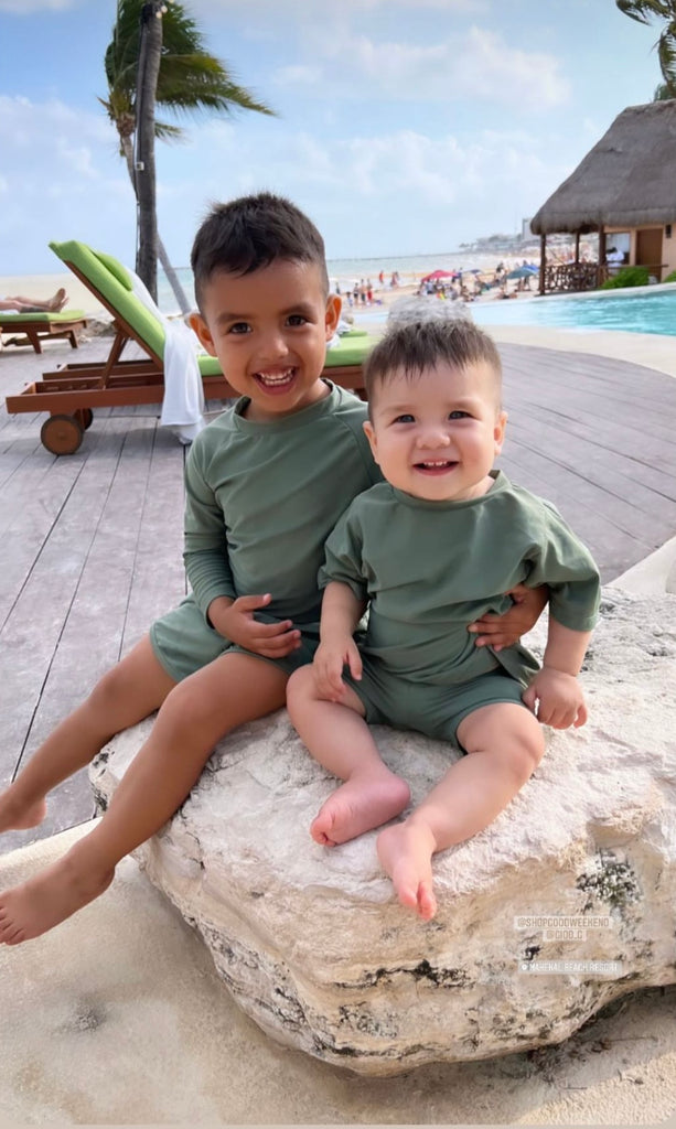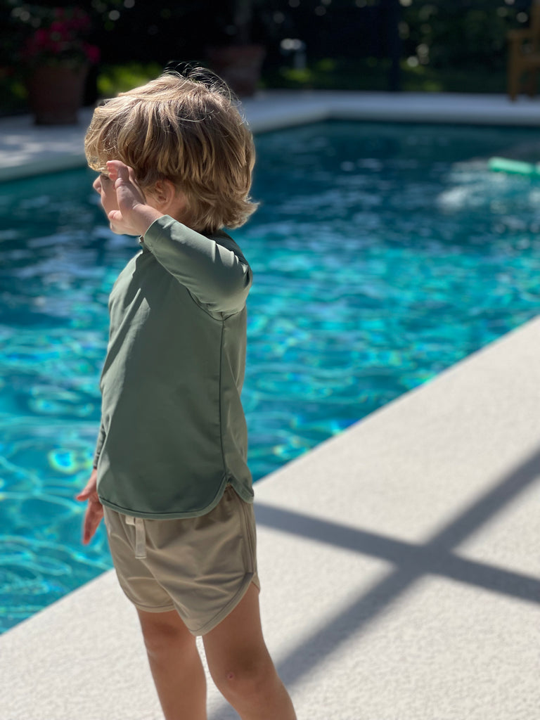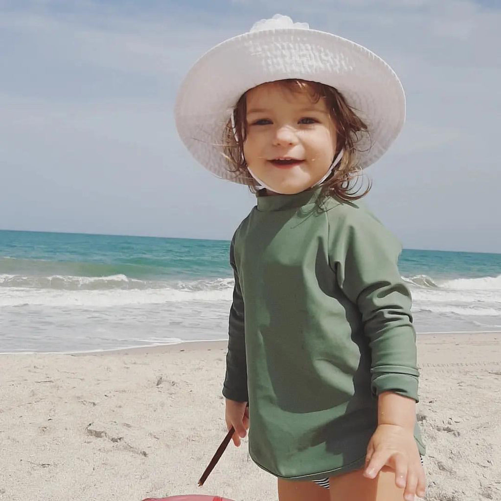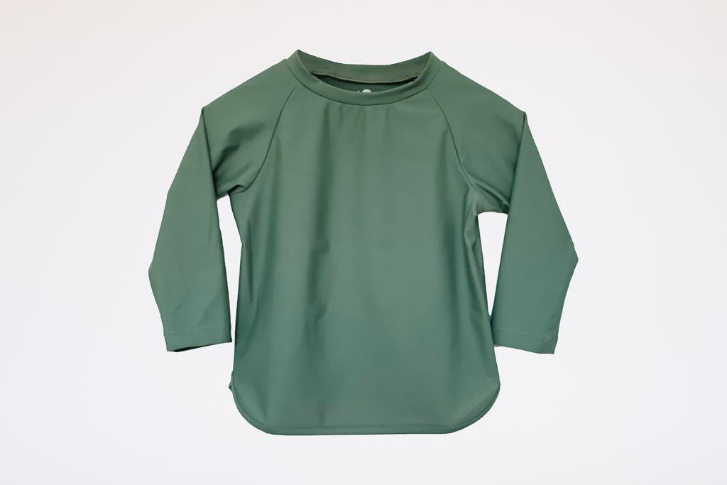 This style offers full sun protection. It comes in our luxury sustainable fabric that feels silky smooth to the touch with no itchy tags at the neck - for extra kid comfort :) Soft yet durable, this recycled fabric is twice as resistant to chlorine and sunscreen than traditional swim fabrics. In Sabal Green color, this rash top is an essential mix and match piece to keep in your drawer and looks great with all of our swimsuits.